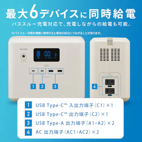 出力端子が多く、USB中心の防災運用がしやすいのがこの機種の良さです。特に、USB-C 60W出力に対応しているので、スマホだけでなくノートPCやPD対応機器にも使いやすいのはポイントです。